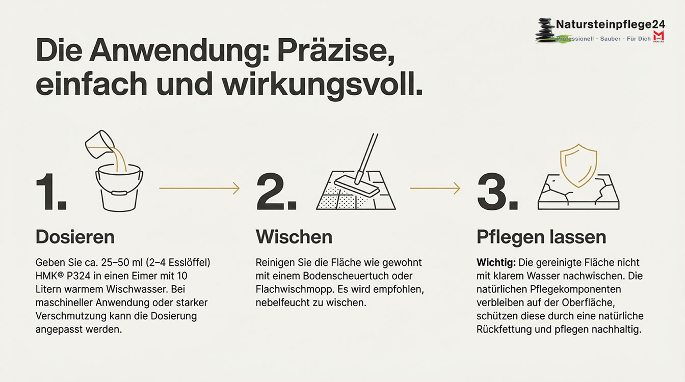 Einfach 25–50 ml HMK® P324 in 10 Liter Wischwasser geben und nebelfeucht wischen. Bei stärkerer Verschmutzung oder zur maschinellen Anwendung kann die Dosierung angepasst werden. Wichtig: Kein Nachspülen erforderlich – die natürliche Rückfettung schützt und pflegt.